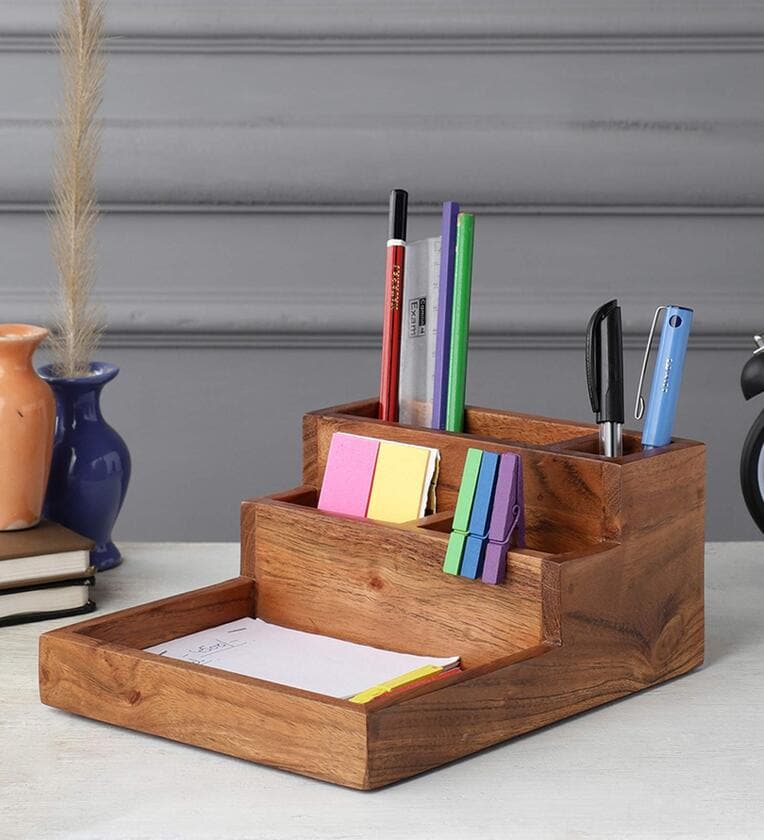 StyleWood collection from VarEesha carries a range of wooden accessories that are sure to style up your home. Solid wood stability and natural beauty, combined with simple classic cuts, that add a certain modern oomph to kitchen and dining, make up this classy collection. Platters, Chopping boards, Holders, Bowls and Organizers in their natural look and organic glory, remind one of a rustic world with a modern twist. Each piece is hand crafted and thus no two pieces are exactly alike. There could be slight variation in the shade, shape or size adding to its authenticity. Hand-made Solid Wood Staircase Desk Organizer from this range is a classy organizer that can hold your pens, scissors and other stationery, making your desk space neat and tidy. Measuring 8x7x3.5 inches in lxbxh, this is made of treated Acacia Wood and has five partitions. It is a very handy piece that can also be an excellent gift and act as a multipurpose storage organizer.