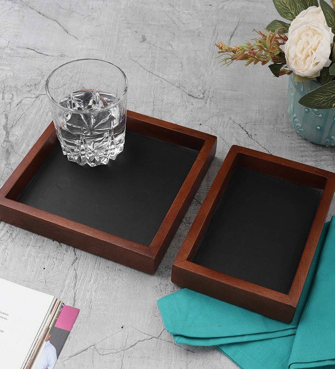 StyleWood collection from VarEesha carries a range of wooden accessories that are sure to style up your home. Solid wood stability and natural beauty, combined with simple classic cuts, that add a certain modern oomph to kitchen and dining, make up this classy collection. Platters, Chopping boards, Holders, Bowls and Organizers in their natural look and organic glory, remind one of a rustic world with a modern twist. Each piece is hand crafted and thus no two pieces are exactly alike. There could be slight variation in the shade, shape or size adding to its authenticity. Sheesham Wood Serving Trays Set from this range is a two piece set with faux leather base. Made of Sheesham Wood, it has two pieces, measuring 7x7x1 & 7x5x1 inches in lxbxh. These small trays are just right for every day needs and can also be excellent gifts.
