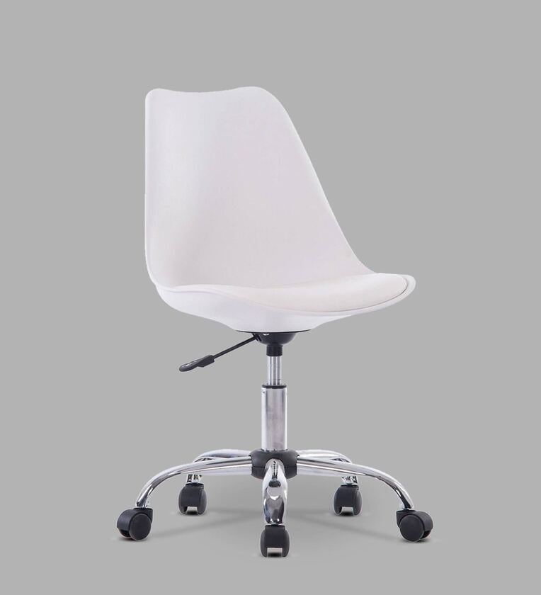 Matte white chair with black cushion solid plastic seat construction with faux leather padded cushion chrome metal base with gas lift.