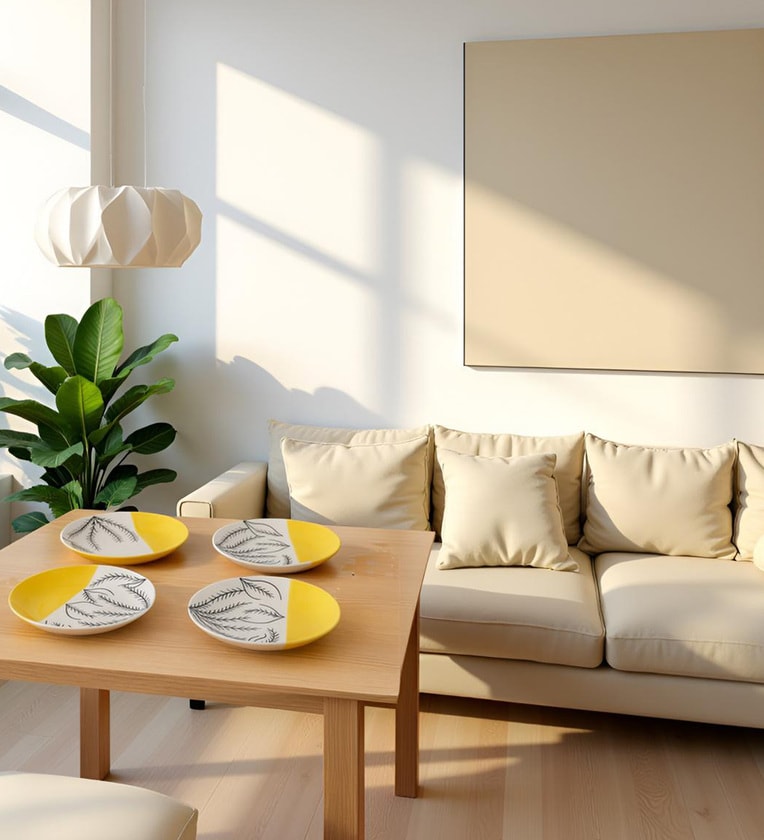 Set of 4 handcrafted ceramic plates with yellow�white dual-tone finish and black leaf artwork; durable, food-safe, microwave & dishwasher safe.