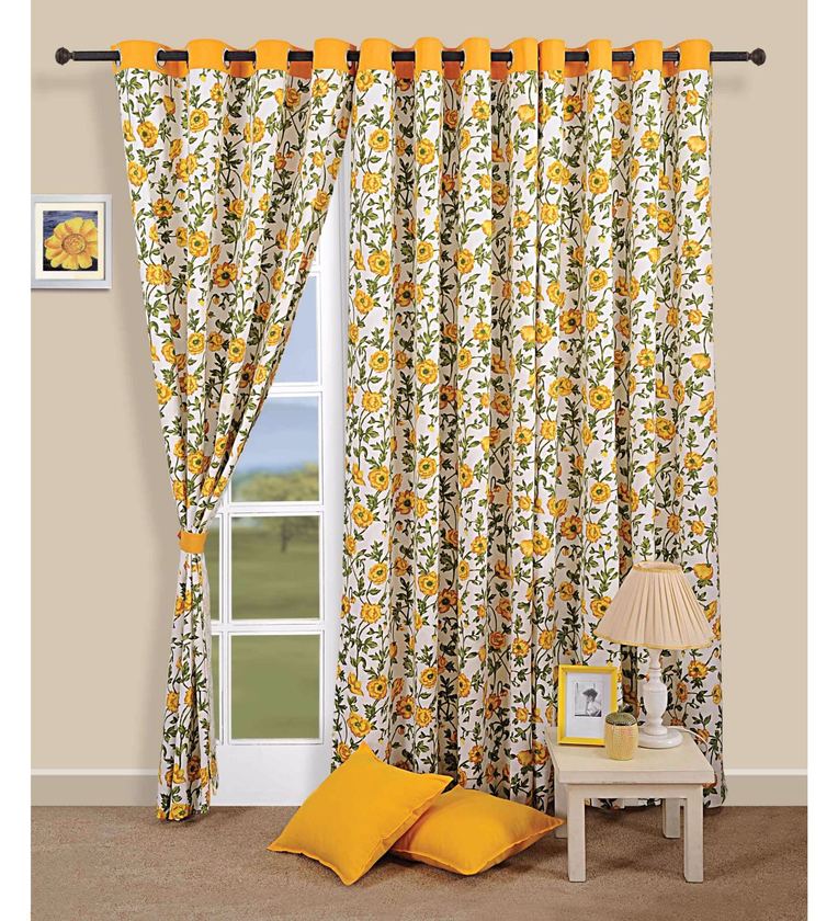 Yellow Cotton Floral 5ft Semisheer Eyelet 1 Pc Window Curtain