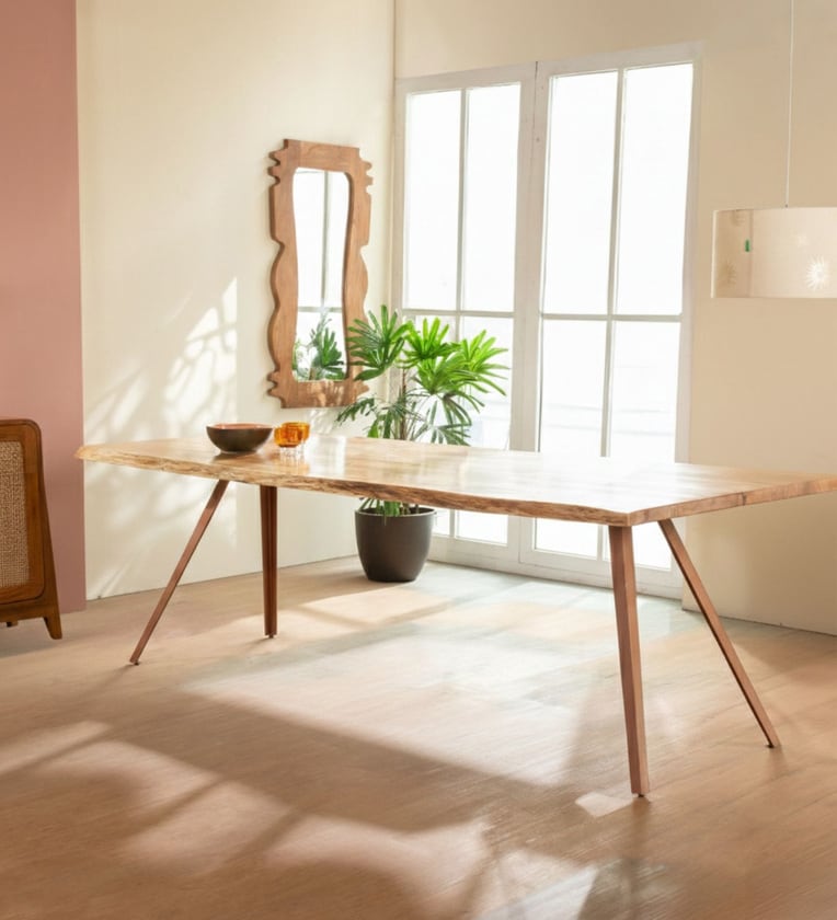 Get ready to bring panache to your dining room with this beautifully poised yet modern dining table. The gnarly, knotty, cracked Acacia wood is as organic as it gets, the branching metal legs up the style quotient, and the gentle curve of the hardwood table top makes this piece a winner. It is ideal for your home if you enjoy entertaining, as a conference table at work and even for warm community dining at cafes.