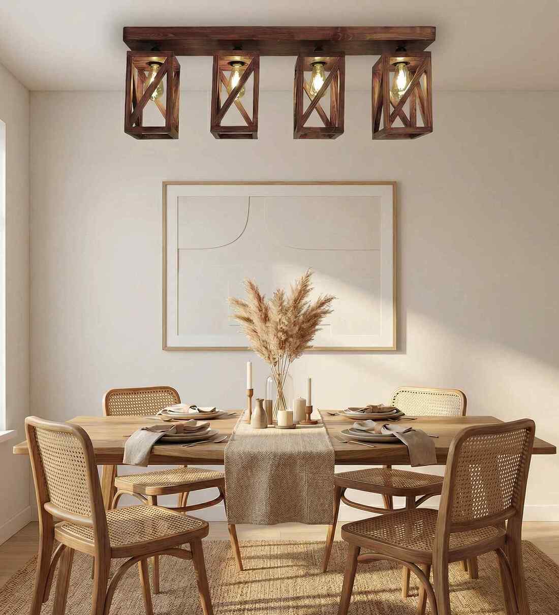 Symmetric 4 Lights Brown Solid Wood Flush Mounted Ceiling Light