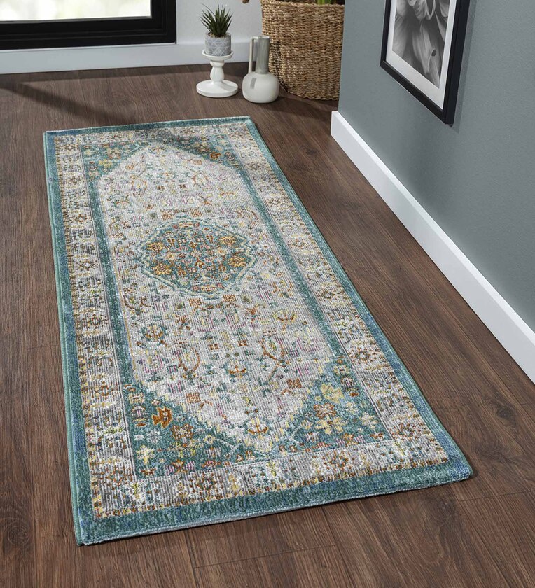 Teal Abstract Polypropylene 59x32 Inches Machine Made Floor Runner