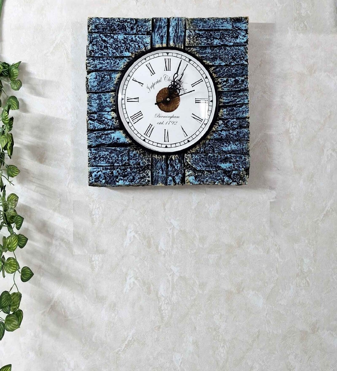 Teal Colour Square Solid Wood Bark Finish Wall Clock