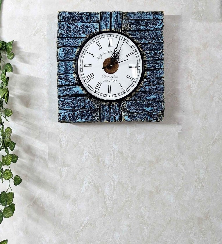 Handmade & Handpainted Teal colour Square Solid Wood wall clock in Distress finish. It has Tree bark all around the clock. It has Roman Numbers. It gives a vintage look & feel to the wall