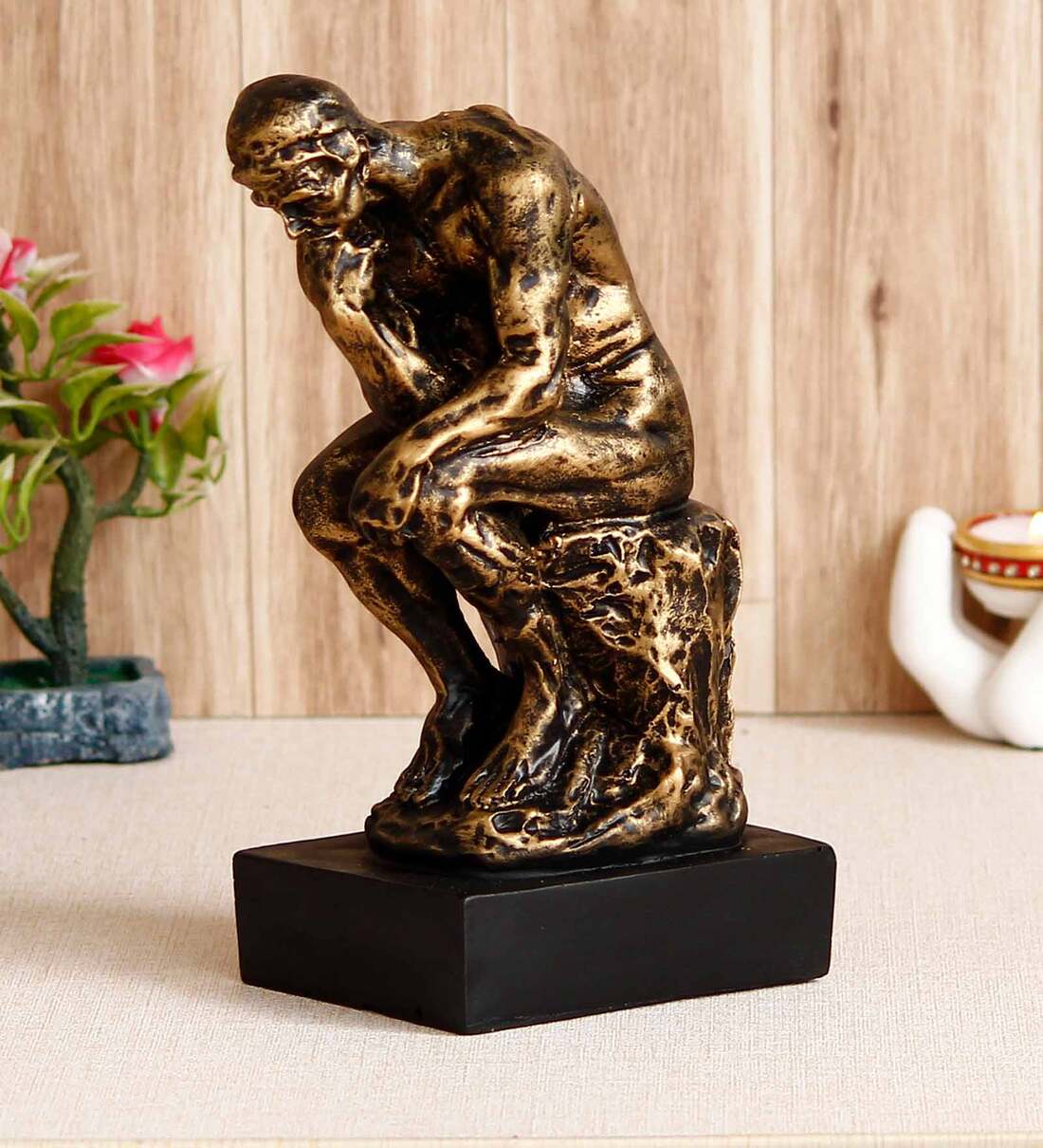 One Antique Finish Thinking Man Sitting on Rock Handcrafted Decorative Polyresin Showpiece