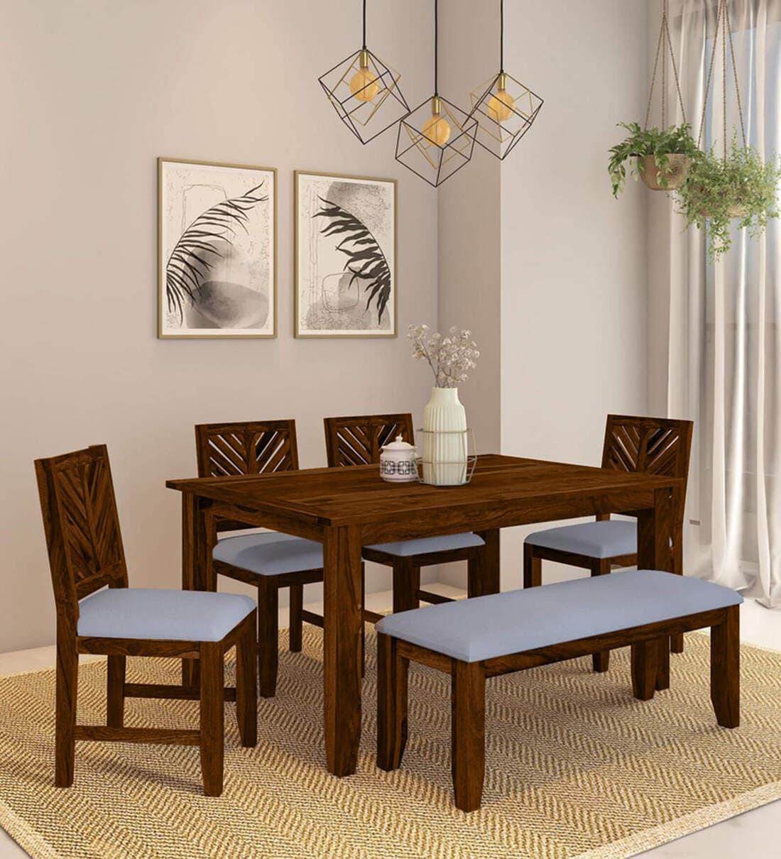 Tourconing Sheesham Wood 6 Seater Dining Set in Scratch Resistant Provincial Teak Finish With Bench