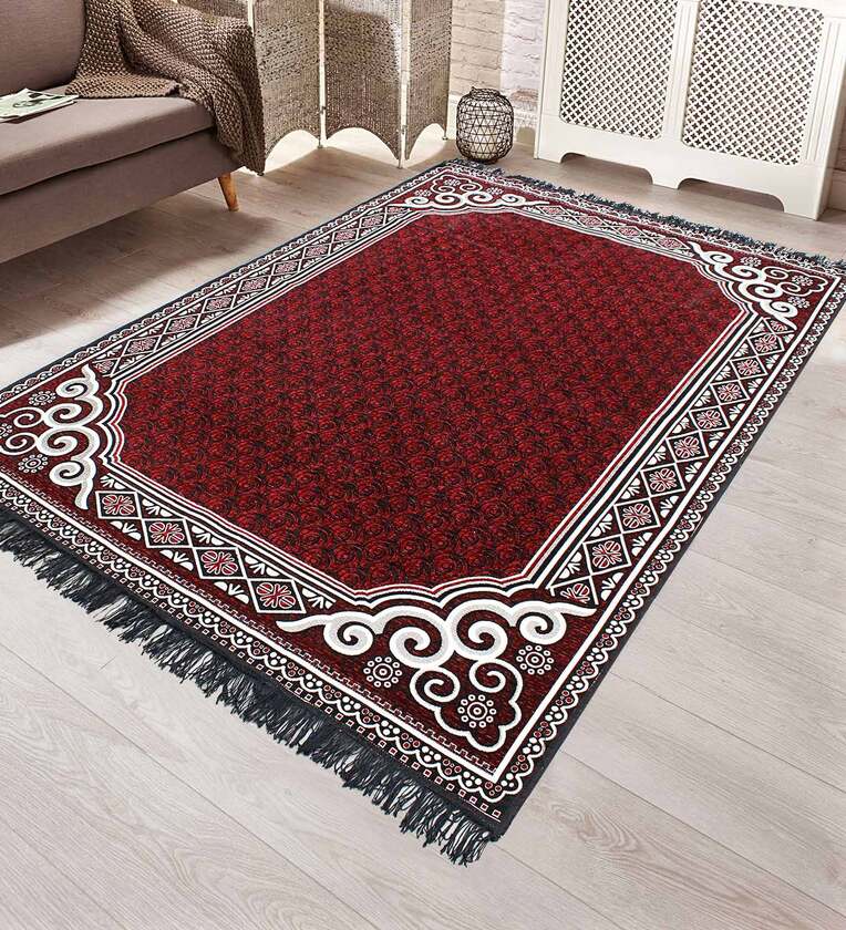 Red Polyester Vintage 5 X 7 Feet Machine Made Carpet
