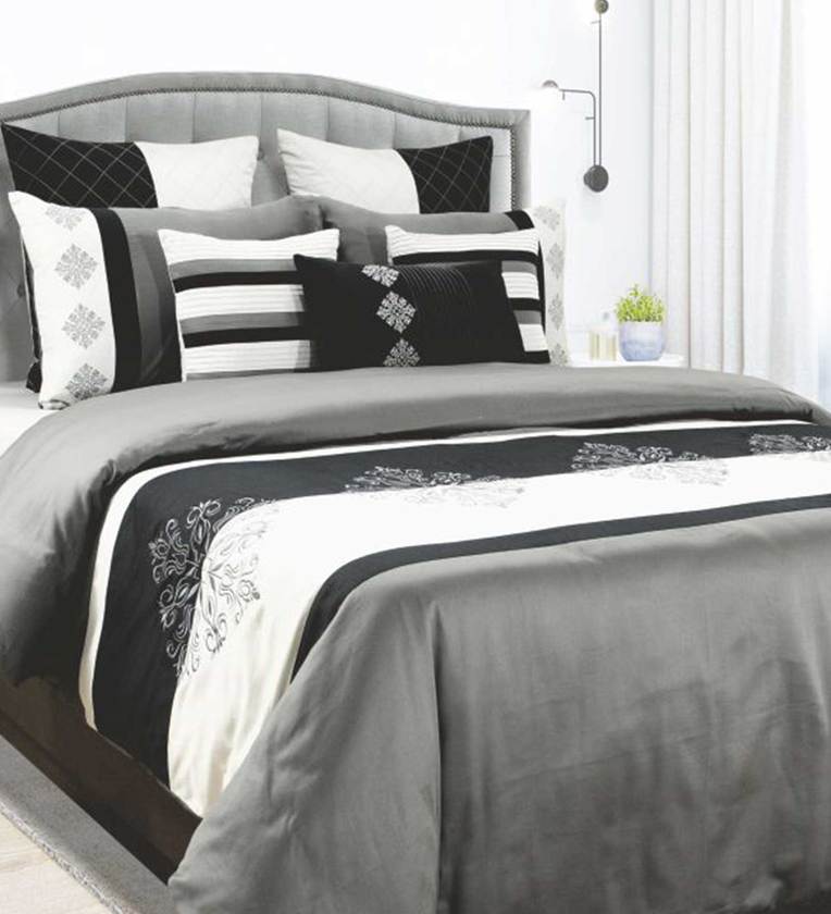 Mark Home 100% Cotton Sateen 400 TC Bed Ensemble Set of 9 Pcs Trinity Silver / Grey / Black