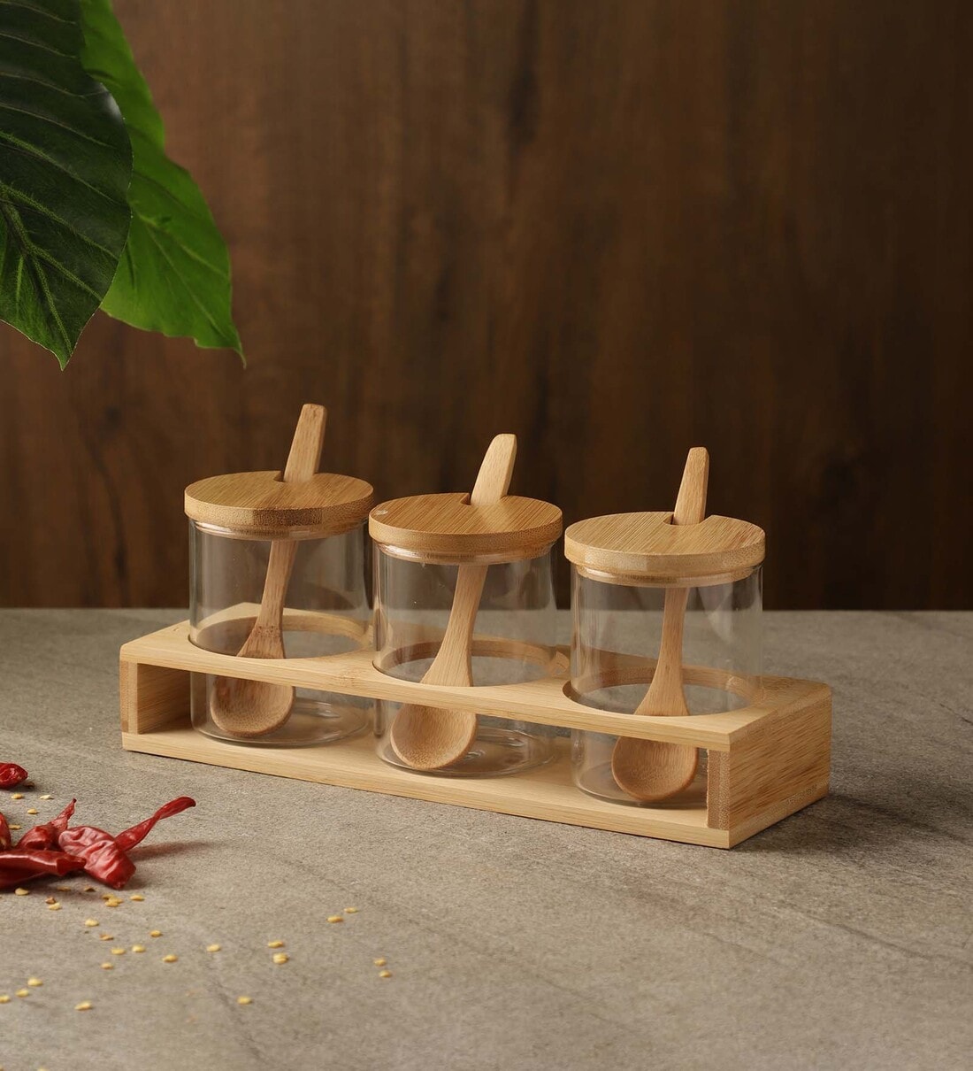 Triple 50ml Engineered Wood 3 pcs Condiment Jar with Spoon