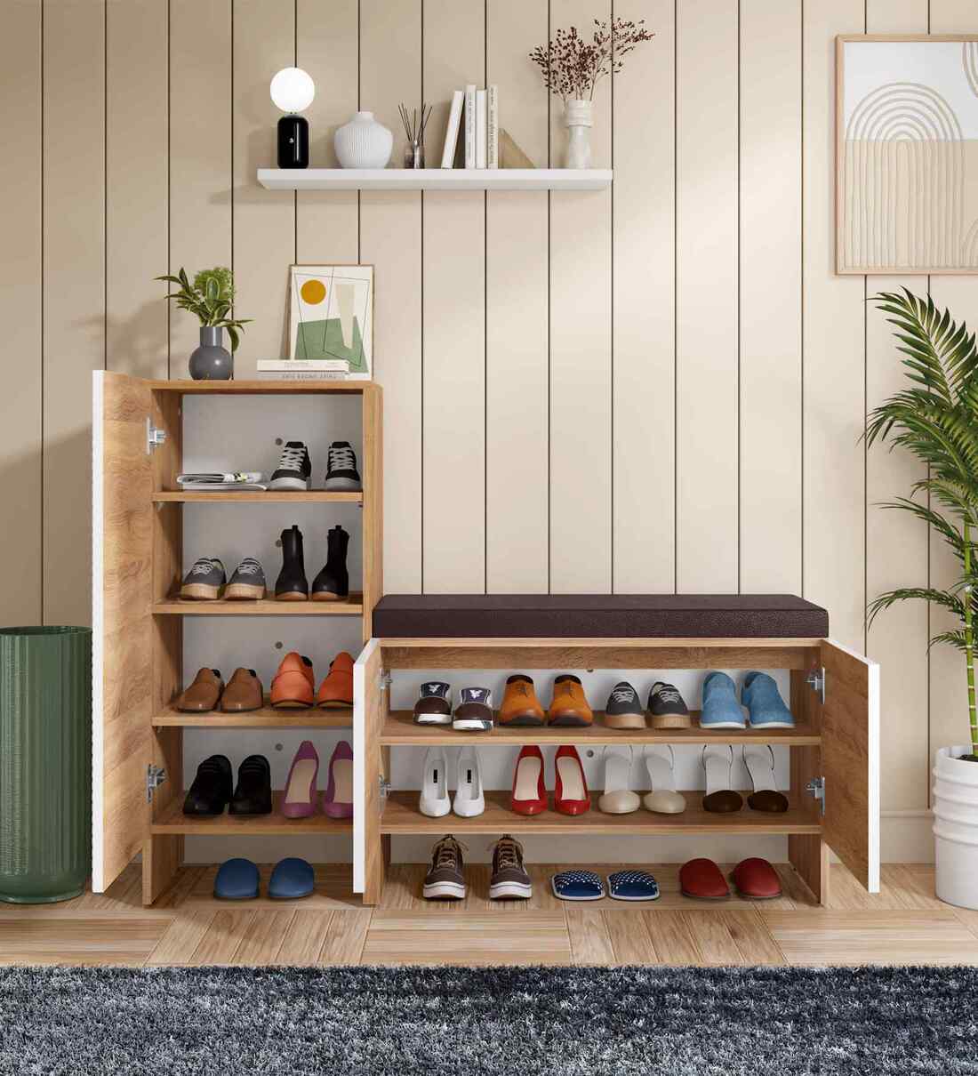 Trudo Modular Shoe Rack With Seating (12 Pair Seat + 10 Pair ) In Oak & White finish