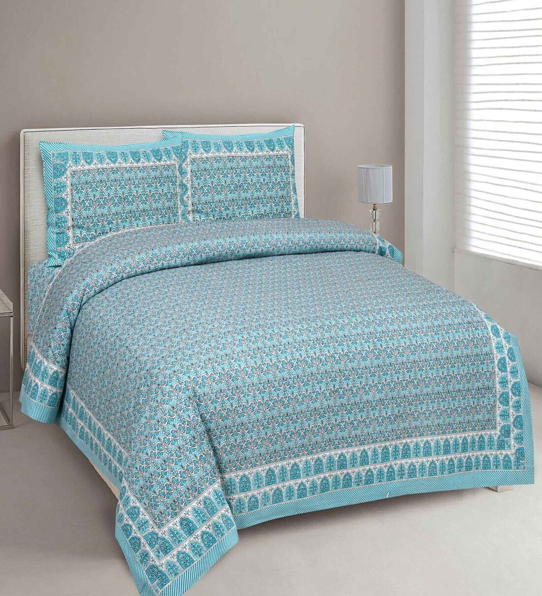 Blue Cotton Traditional King Bedsheet with 2 Pillow Covers
