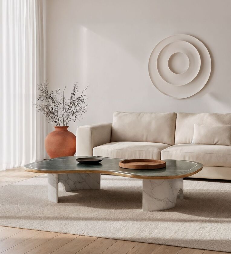 Elevate your living space with the Uku Marble Top Coffee Table from Kensho's exclusive collection. This sophisticated piece features a striking green marble top paired with a stavario marble base, unified by a sleek stainless steel rim. Each design is meticulously crafted and protected as an original creation. The harmonious blend of premium marble varieties and refined metalwork delivers both visual impact and lasting durability, making it an investment-worthy centerpiece for discerning interiors.