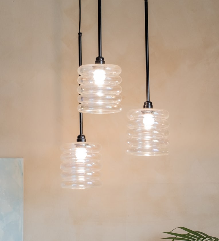 Descriptions - A sculptural composition of multiple Unio pendants, this cluster lamp brings visual rhythm and diffused light to dining spaces or stairwells. Rippled glass and brass details offer vintage appeal in a modern form.