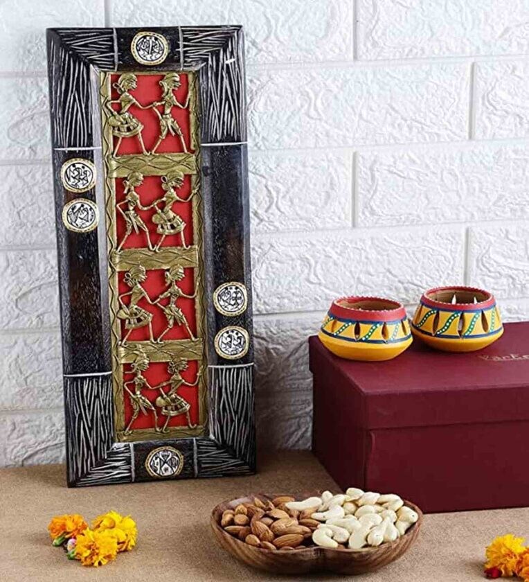 India is rich with a diverse range of cultures, languages and festivals. Our people are vibrant, joyful and like to celebrate with grandeur and shimmer. Diwali is one of the most celebrated festivals across the world, not just our heartland. The Festival of Diwali binds people and is a synthesis of spirituality, religion, culture and social values. It is a festival full of sweet childhood memories, a sky full of fireworks, a mouth full of sweets, a house full of diyas and a heart full of joy. Exchange of gifts also forms an integral part of this festive spirit. To create this delightful moment and an experience to remember, this festive season, VarEesha brings forth a range of individually curated festive Gift Boxes - Upahaar. Not only for Durga Pooja or Diwali, these gift boxes are ideal for housewarming too. A thought or wish giving your best to your loved ones makes the gifting experience all worth it. You would love the glow of happiness on the receiver's face that will enlighten your soul even more. The Upahaar Hand-made Dhokra Wall Hanging Gift Box is a wonderful part of this series, that contains a hand painted wooden wall hanging along with two hand painted terracotta tea light holders/diyas to bring the pious feeling of eradication of dark shadows and evil. Using various motifs of the tribal Dhokra art, this beautiful craft depicts rural life of tribes in ancient Chhatisgarh region. Made of brass with mango wood frame, this 6x0.5x17 inches wall hanging in a must have. Wishing the receivers very best for the festival and the year forward, there is also a classy best wishes card in this hand made reusable box. Bringing with them, positive vibes and warm fuzzy cheer, these boxes are not just to gift, they are to get.