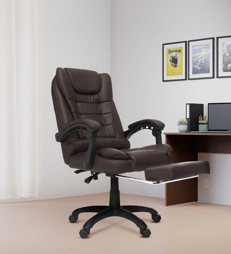 SUPERIOR LUXURY & COMFORT: The premium luxury PVC leather with sturdy board and sponge make provides unmatched cushion and luxurious comfort during long, intense work hours UPHOLSTERY: Soft touch High Grade PVC leather that provides a premium matte shine finish ADJUSTABLE: Rest & relax with recline feature up to 135 degrees and extendable footrest TECH SPECIFICATIONS: Weight Capacity - Upto 110 kgs | Height Suitability- 5ft.-5ft.10" | Chair Height - 45.5-48.5 inches | Seat Width- 21 inches | Seat Depth - 21 inches | Internal Frame Material- Wood |Upholstery cover- Leatherette | Colour - Brown | Size- High Back | Gas lift - Class 3 | Base - Heavy Duty Nylon Base | Castor Wheels - 50mm PU Castor Wheels