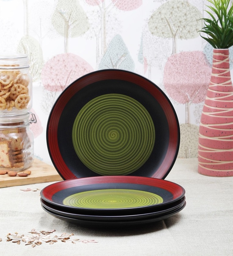 Hunar collection from VarEesha is a bouquet of hand crafted ceramic tableware that highlight the patience and perseverance of skilled craftsmen across our cultural heritage. Each piece goes through the long process of clay baking, painting, shading, re-baking and glazing. Applause worthy is the effort that goes in replication of sparkle, shading and fusion of colors which must come out similar despite being uniquely hand made. Every piece is pain stakingly hand painted separately and thus may differ slightly from each other in size, color and shape. Bottle Green with Maroon Ceramic Dinner/ Full Plates Set is a part of this range that has four dinner plates. These are lead free and microwave safe.