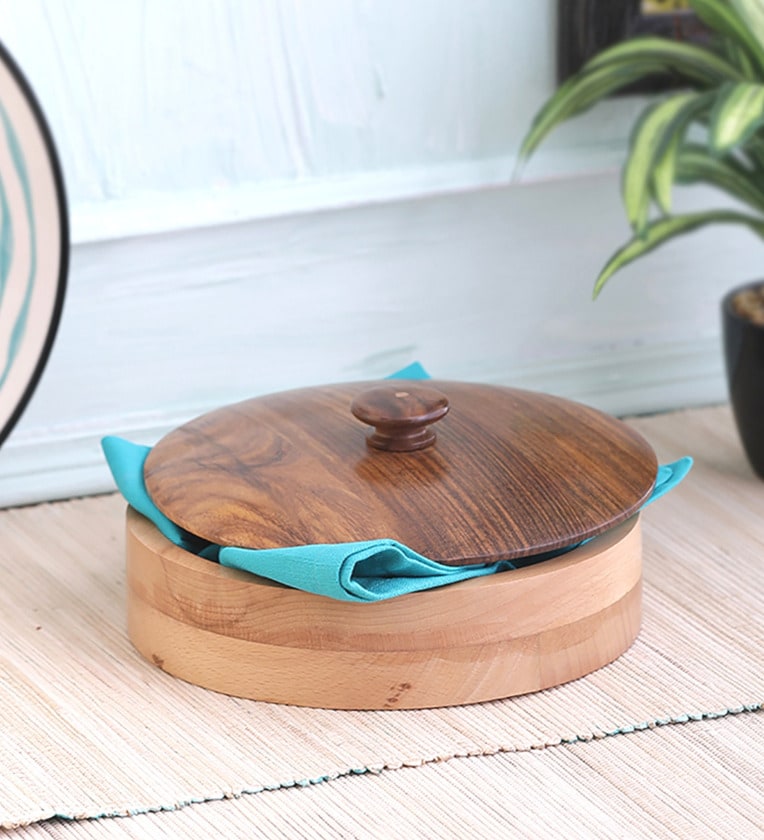 Make your dining experience memorable with VarEesha's uniquely designed and handpicked dining acessories. Made of Sheesham wood, this Enamelled Casserole Chapati Box / Multipurpose Storage box is an attractive and useful table accessory. The round box has a separate lid to keep the stuff warm and fresh. The lid has golden enammelled flower work to make the box more appealing. The wooden box measures 8 x 2 inches in Dia x h and can be wiped clean easily while its not microwave and dishwash safe.A one stop-shop for home decor and furniture, Pepperfry sells a home product every 30 seconds.
