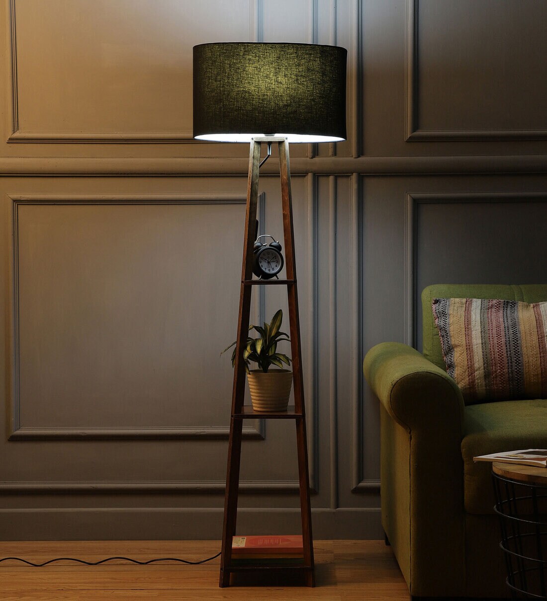 Victoria Black Cotton Fabric Shade Shelf Floor Lamp With Wood Base