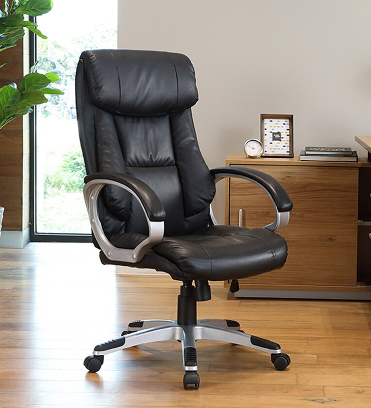 VIN Office Chair - High backrest SUPER SOFT chair Introducing the VIN Office Chair, a high-back chair designed for those who appreciate comfort. This chair embodies a perfect blend of softness, comfort, and elegance, offering an elevated seating experience for your everyday work. With its economic luxury design, it provides a premium seating option that allows you to indulge in unparalleled comfort throughout the day. Key Features: - Backrest: The backrest is constructed with a wooden structure and features a 10 cm thick foam, upholstered in black PVC leather for a comfortable feel. - Seating: The seat is designed for maximum comfort, featuring a 10 cm thick foam cushion with black PVC leather upholstery. - Armrests: The chair is equipped with fixed armrests made of silver nylon, adorned with a PVC pad for added comfort. - Tilt Mechanism: a 105-degree tilt angle and features a lock position for enhanced stability. - Height Adjustment: The chair's seat height can be easily adjusted between 45.5-55 cm using the hydraulic gas lift system (Class 2). - Base: Silver nylon coating legs with nylon castors - Dimensions: The overall dimensions of the chair are 70X79X112-121.5 cm.