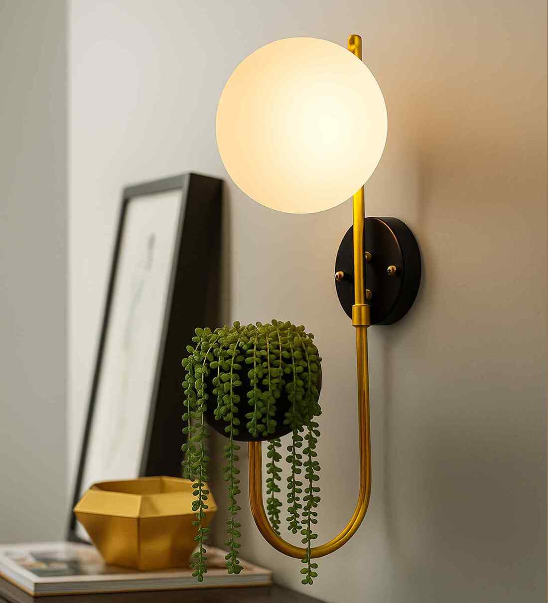 Wall Light Geometric Wall Lamp, Modern Wall Lamp with Storage Planter for Living Room Study Stairs Bedroom Lights Bedside, Round Glass, Black Gold