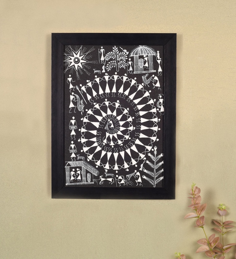 Warli Symphony Black Wood and Canvas Painting
