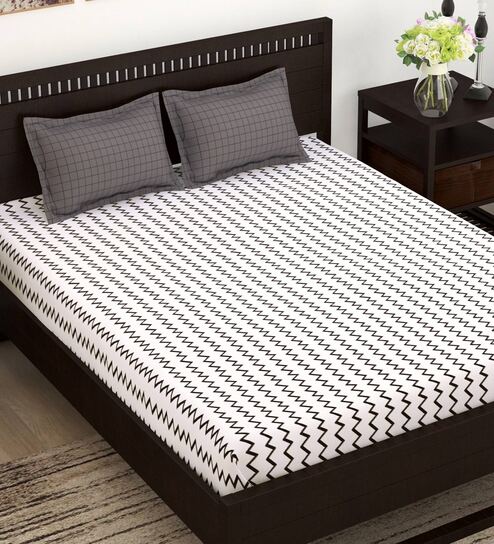 White Abstract 144 TC 100% Cotton Queen Sized Bed Sheets with 2 Pillow Covers