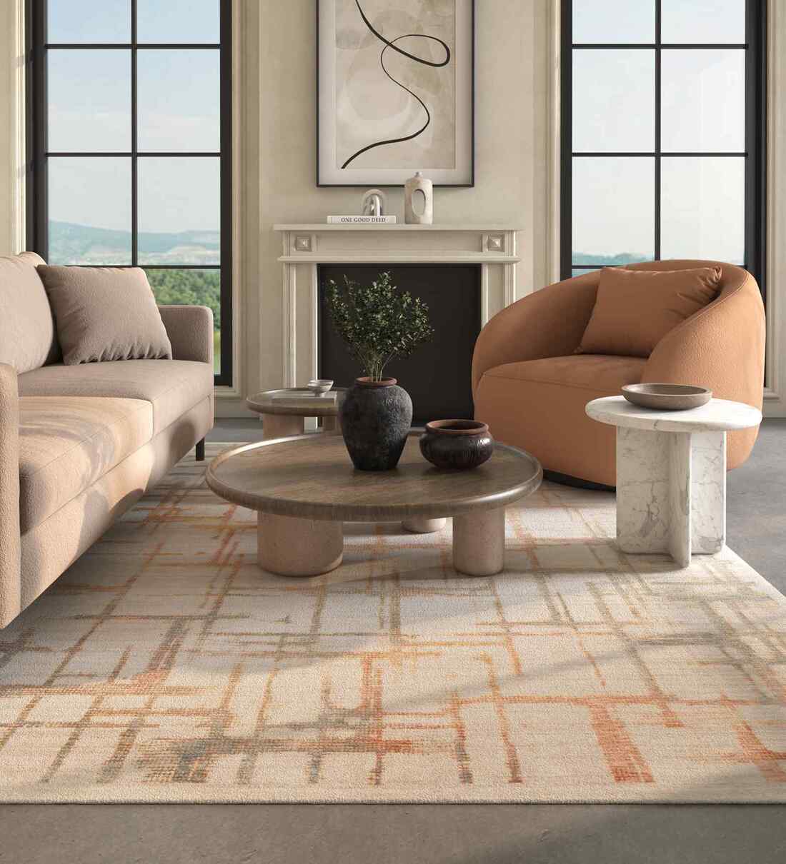 White and russet combine in a modern abstract rug that feels both lively and refined. Its flowing pattern introduces subtle energy into neutral spaces.