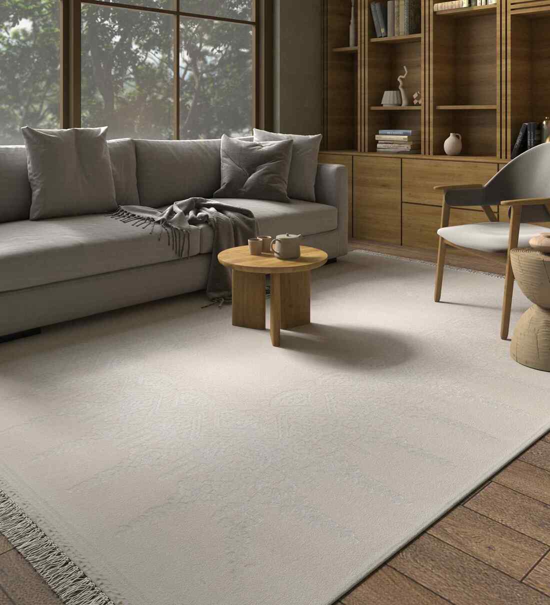 White and soft grey in a solid design that speaks through texture rather than pattern. Its clean look makes it timeless and adaptable.