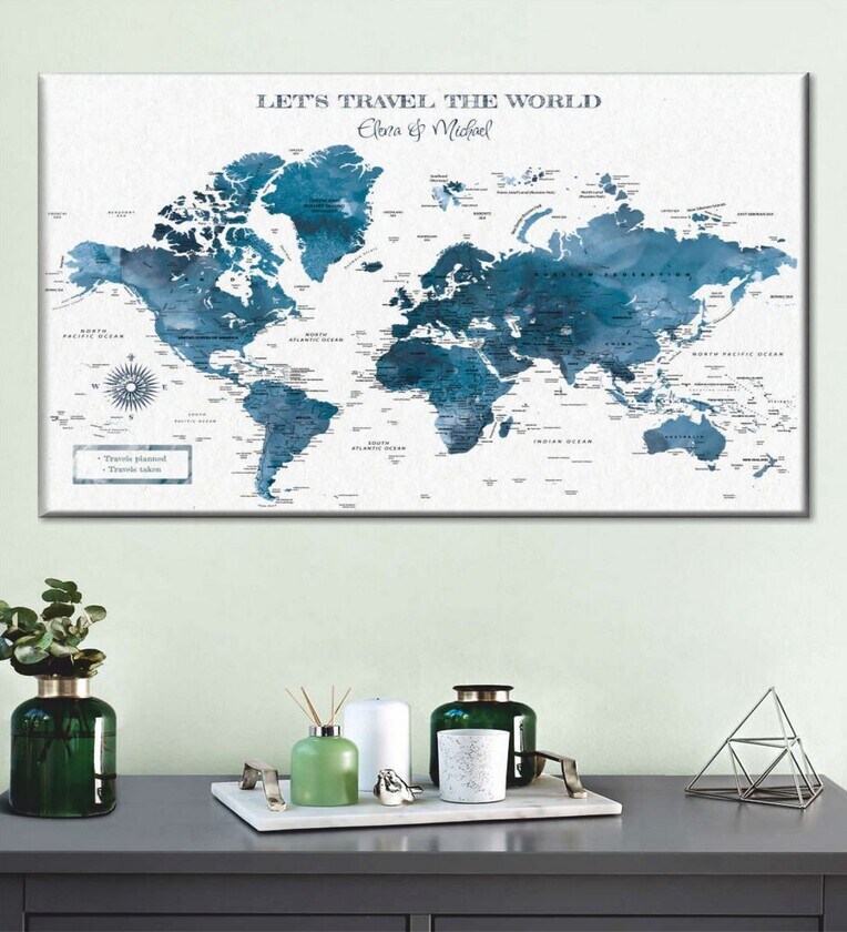 POSTERS AND TRUSS White Blue World Map Printed Framed Wall Art
