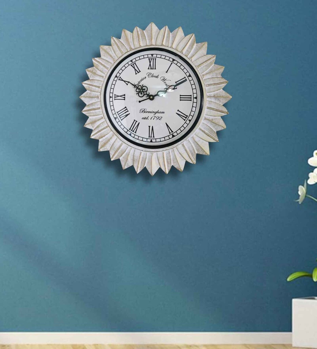 Handmade & Handpainted White colour Engineered wall clock in Distress finish. It has a Sun Flower design around the clock. It has Roman Numbers. It gives a vintage look & feel to the wall