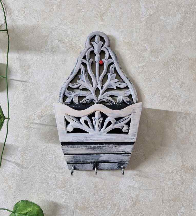 White Colour Sheesham Wood Key Holder in Distress Finish