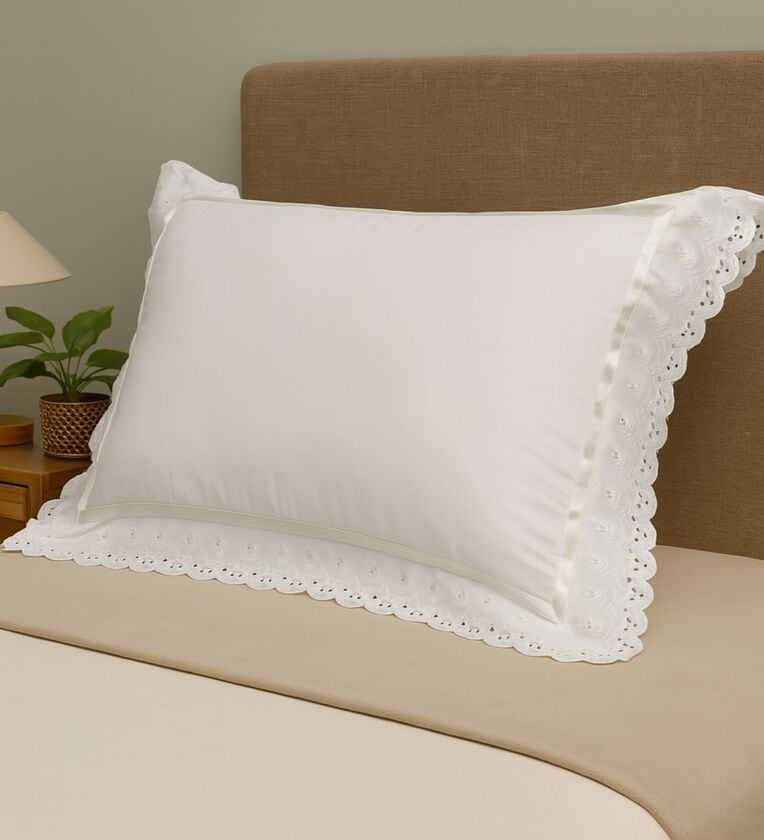 Add a touch of timeless elegance to your bedding with the YORA HomeStyle Double Lace Frilled Pillow Cover Set where craftsmanship meets quiet luxury. Made from soft, breathable cotton, each pillow cover is adorned with delicate eyelet embroidery and finished with graceful double-layered lace frills. The intricate detailing, combined with a clean satin border, brings a romantic charm to your personal space. Perfect for those who appreciate understated beauty, these cotton pillow covers transforms any bed into a serene, styled retreat. Whether you're dressing a cozy guest room or elevating your master suite, these premium pillowcases bring together gentle textures, timeless design, and thoughtful comfort.