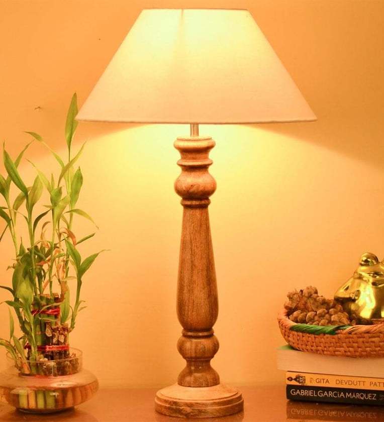 White Fabric shade Table Lamp with Wood base