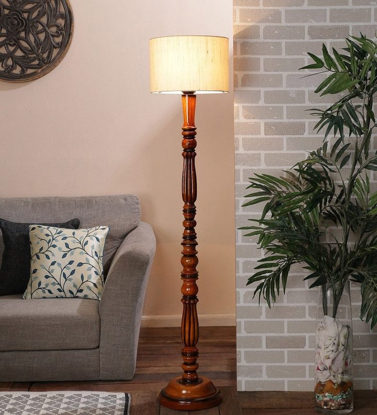 White Fabric Shade Floor Lamp with Brown Base