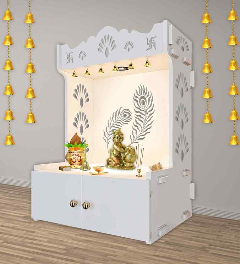 White Finish Art of Mor Pankh Floor Temple with Spacious Wooden Shelf & Inbuilt Focus Light