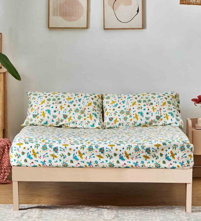 White Floral 144 TC Cotton Blend Queen Sized Bed Sheets with 2 Pillow Covers