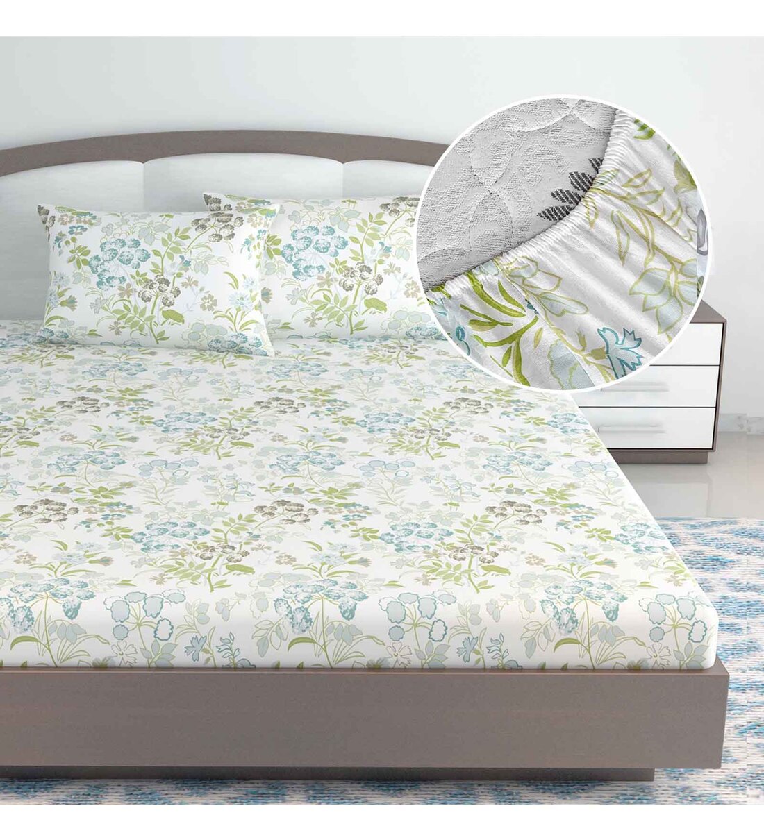 White Floral 144 TC Cotton King Fitted Bedsheet with 2 Pillow Covers