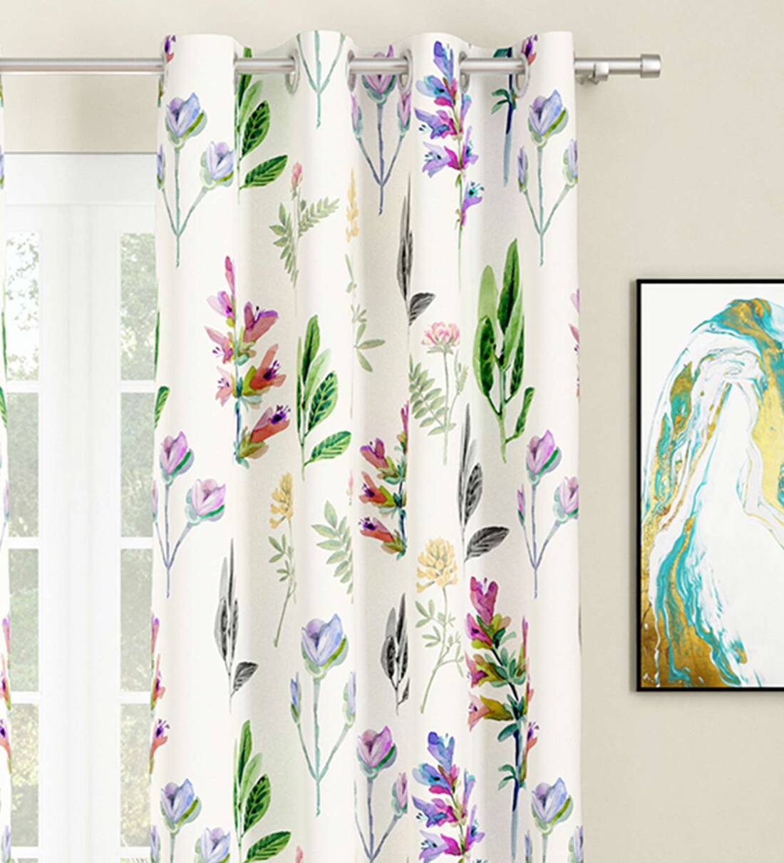 White Floral Polyester 9 Ft Light Filtering Eyelet Door Curtains (Set of 2)
