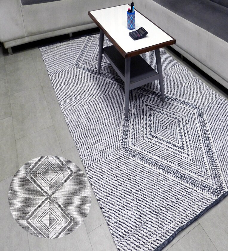 White Geometrical Cotton 8X5 Feet Hand Woven Carpet