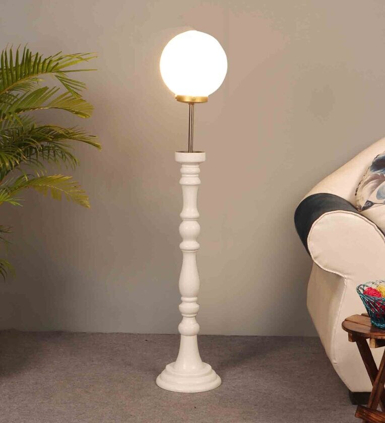 White Glass Shade Club Floor Lamp With Pine Wood Base