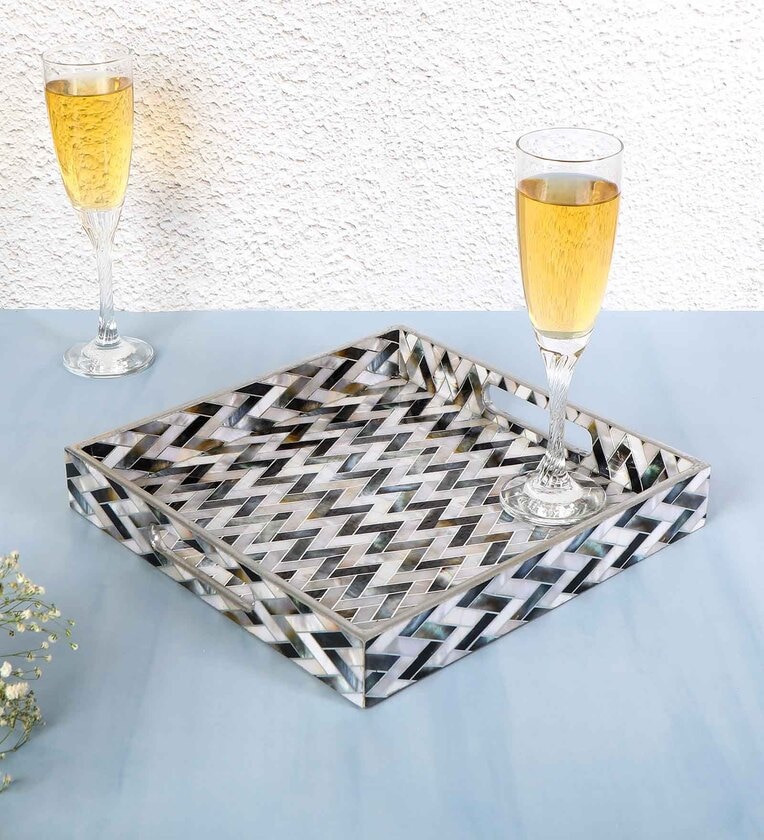 White & Gold, Black MDF Wood Zigzag Square Serving Tray