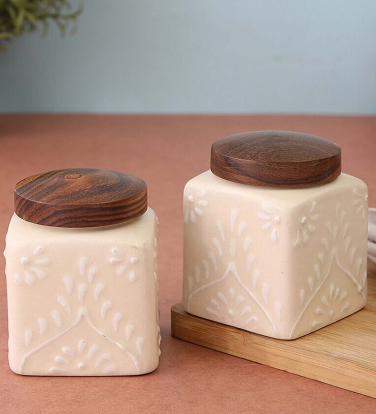 Kitchen storage and serve ware get a beautiful life with VarEesha's Shilpkala collection. Rural artisans bake, paint & shade these items and then emboss them. They are made and glazed at extremely high temperatures making it difficult to predict the exact shade outcome. Applause worthy is the effort that goes in replication of embossing, shading and fusion of colors making each of these pieces one of a kind. Every piece is hand crafted and painted separately and thus may differ slightly from each other in size, color and shape. White Embossed Ceramic Square Jars Set is a part of this range that has two jars measuring 3.5x4 inches in diaxh. Each has a capacity of 450 ml and is suitable for pickles, chutneys or sauces etc. The jars are convenient to handle. They are microwave and dishwasher safe without the wooden lids.