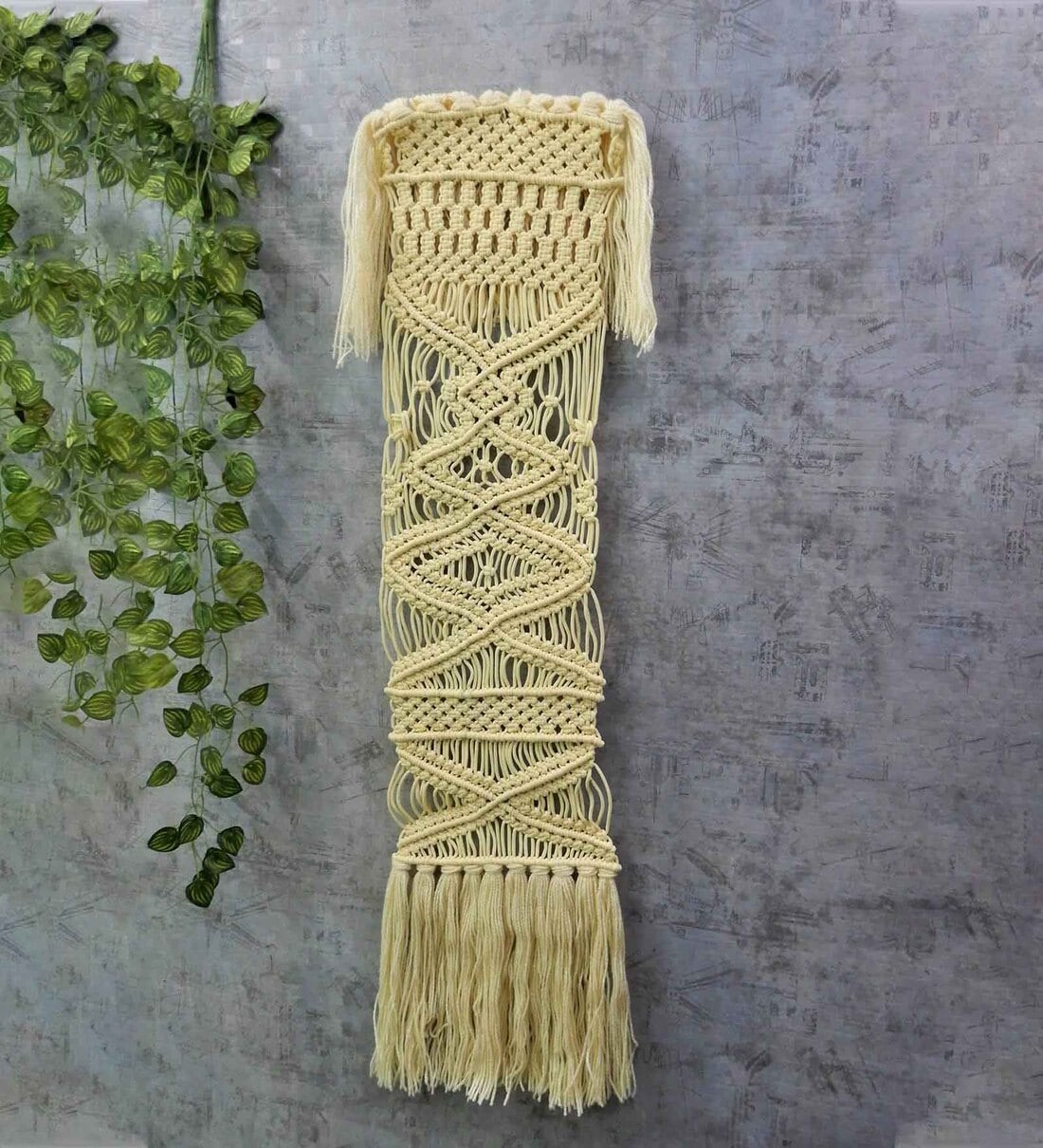 This is a handmade Boho Table Runner cum Wall hanging made up of thread work (Macrame). - Can be used as a Table Runner for Coffee Table or as a Wall hanging Decor - Size is 48 inch by 10 inch - Cream Thread Used
