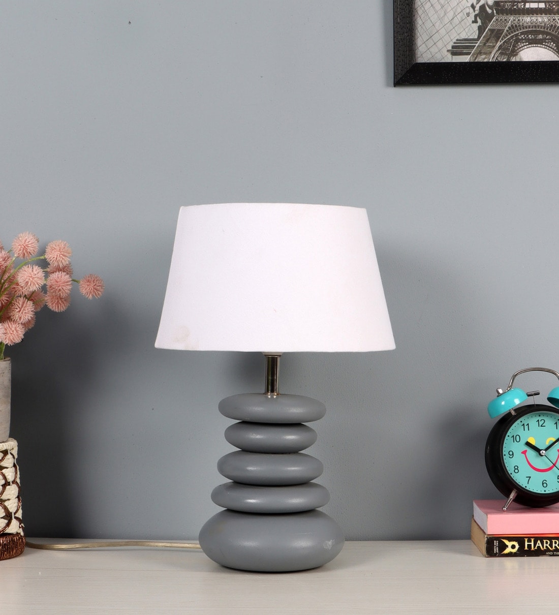White Iron & Cloth Shade Tablel Lamp With Grey Base
