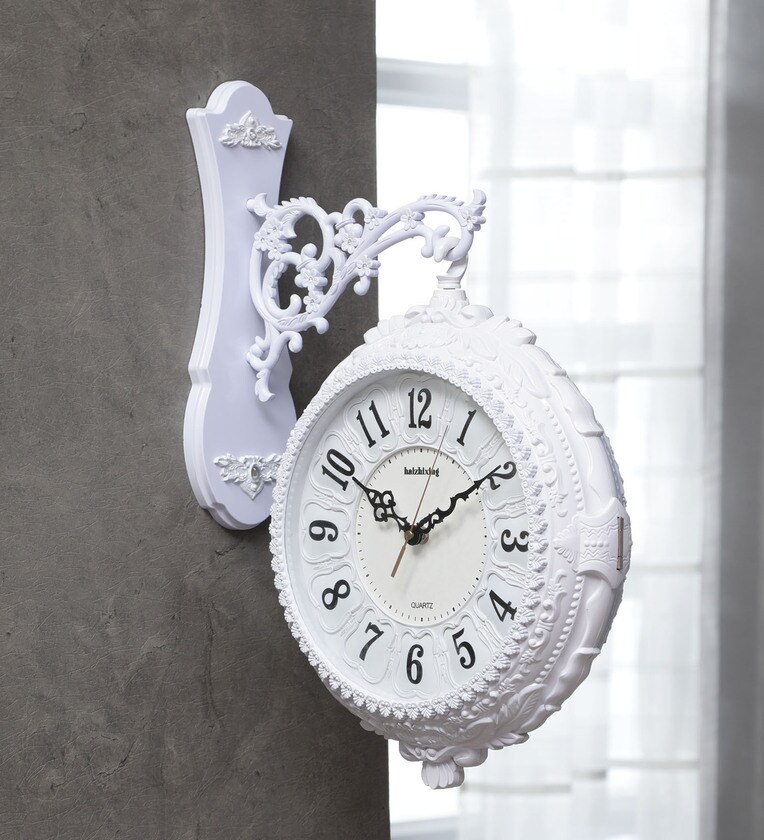 This beautiful clock with a scrolled wall mount is inspired by the antique clocks that hang in train stations. This clock looks lovely on a kitchen or living room wall and makes a wonderful housewarming, wedding or anniversary gift. Its unique two-sided design lets you read the time at any angle. The clock includes a wall bracket and requires 2 x AA batteries. The hand-forged hanger and casing in a fine black finish add to the old world charm and style of this clock. Finished off with an aged ivory face and glass cover.