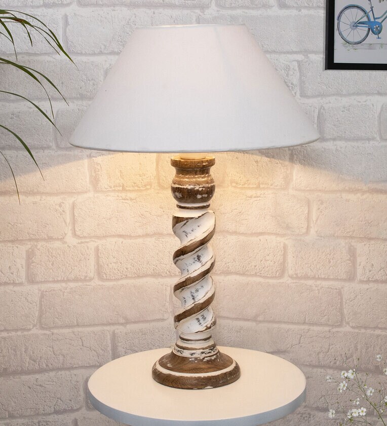 White Shade Table Lamp With Wooden Base