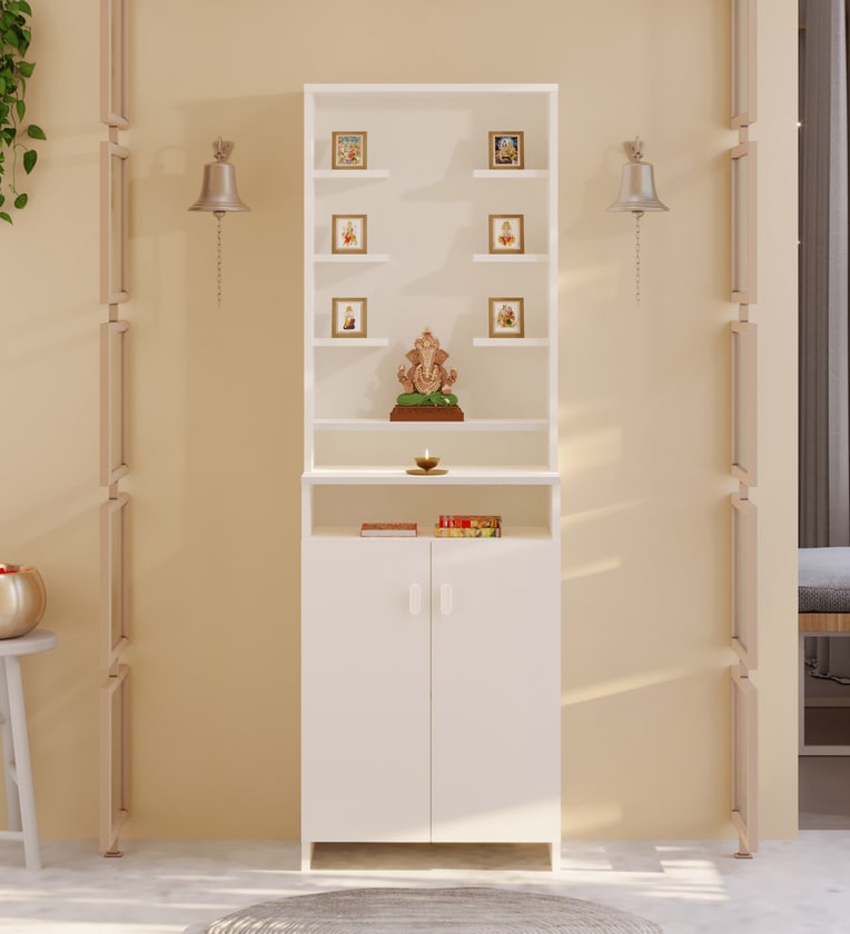 BLUEWUD Shubh Pooja Mandir is a beautifully crafted temple unit for home, designed to create a serene and organized prayer space. Finished in an elegant White tone, this floor-standing puja room altar enhances the spiritual ambience of your home or living room. It comes with a storage cabinet that offers ample space to keep spiritual essentials, pooja samagri, and offerings neatly arranged and easily accessible. The thoughtful design makes it convenient to organize incense sticks, diyas, bells, and other prayer items, ensuring a clutter-free worship area. Built from premium quality engineered wood, the mandir is sturdy, durable, and easy to maintain. Delivered in a DIY (Do-It-Yourself) format, it is simple to assemble with step-by-step instructions. Whether placed in the living room, dedicated pooja corner, or as a home temple, the BLUEWUD Shubh Pooja Mandir combines functionality with divine elegance, making it a perfect addition to modern Indian homes.