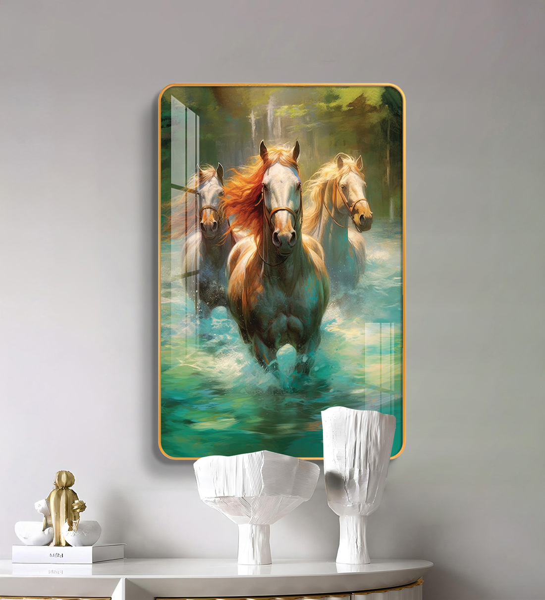 Bring home the timeless elegance of nature with our Wild Waterscape Horses Wood Glass Finish Wall Art. The vibrant hues and intricate detailing of the design, a perfect balance of grace and grandeur, making it a captivating centerpiece for your living room, hallway or bedroom. Designed to symbolize prosperity, beauty, and positivity. High-definition print, Durable long-lasting quality material wall art perfect for modern and traditional interiors